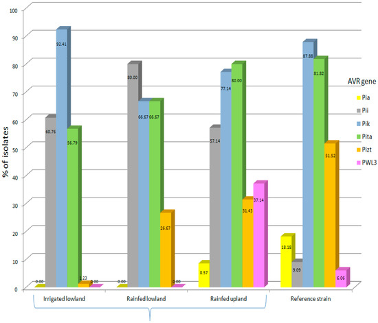 A total of 131 contemporary and 33 reference isolates representing a number of multi-locus genotypes of Magnaporthe oryzae were subjected to a PCR test to detect the presence/absence of avirulence (Avr) genes. Results revealed that the more frequently occurring genes were Avr-Pik (81.50%), Avr-Pita (64.16%) and Avr-Pii (47.98%), whereas the less frequently occurring genes were Avr-Pizt (19.08%) and Avr-Pia (5.20%). It was also laid out that the presence of Avr genes in M. oryzae is strongly associated with agroecosystems where the complementary resistant (R) genes exist. No significant association, however, was noted on the functional Avr genes and the major geographic locations. Furthermore, it was identified that the upland varieties locally known as “Milagrosa” and “Waray” contained all the R genes complementary to the Avr genes tested.