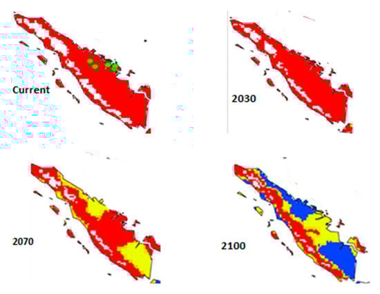 Maps of Sumatra demonstrating suitable climates for growing oil palm at present and in 2030, 2070, and 2100. Red = highly suitable climate; yellow = suitable climate; blue = marginal climate; white = unsuitable climate. The maps represent the CSIRO-Mk3.0 global climate model running the Special Report on Emissions Scenarios (SRES) A1B scenario [13].
