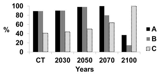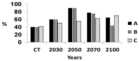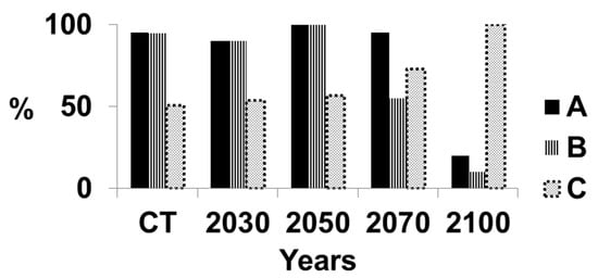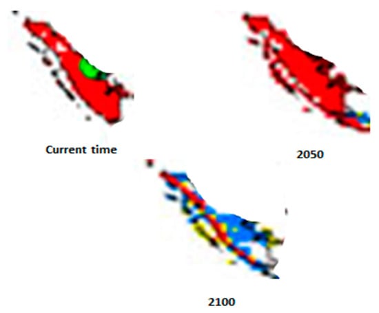 Figure 4 indicates the levels of suitable and highly suitable climate together and highly suitable climate alone for growing oil palm in Sumatra. The projected levels of G. boninense infection are also provided. The infection will increase significantly because of the decrease in the suitability of the climate for growing oil palm as discussed in References [1,6,13,14,15,16], together with the inherent virulence of G. boninense. The suitability of the climate for oil palm growth slightly will increase until 2050, indicative of mountainous regions having an increasingly suitable climate. However, by 2070, there will be a decrease in highly suitable climate, until a very low level is reached by 2100. There will be a fairly small increase in basal stem rot from 41% until 2050, after which time, the increase will be dramatic. The disease level will reach 100% by 2100.