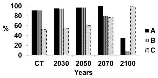 Furthermore, the crop will experience generalized climate stress in Sumatra after 2050, leading to more BSR [1,6,13,14]. Cold stress in current time for growing oil palm in Sumatra was localized largely in mountainous regions, as might be expected, amounting to ca. 10% of Sumatra [13]. This becomes almost absent by 2100, indicating that oil palm could be grown in these regions, possibly with lower BSR. When crops are moved to new regions, the levels of disease can decrease from the “parasites lost” phenomenon [1]. However, other factors will determine if oil palms can be grown in mountainous regions, such as the slope of land and type of soil. There is no heat stress at present: This will become apparent in ca. 5% of Sumatra towards the south east in 2100 [13]. It is likely that oil palm will not grow in that region and, consequently, BSR will be irrelevant. There was no dry stress at present in Sumatra, but data were not available for 2100. The equivalent data in Reference [14] indicated there were none of these stresses in 2050 and 2100, although the definition of the world maps was lower.