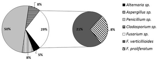 Maize and its pathogens prevailed in veterinary diets studied but their presence in the sample was not always associated with the occurrence of the respective mycotoxins. It might be due to environmental conditions which determine the production of mycotoxins by Fusarium, and which could be far from optimal ones (15–30 °C and 0.98 aw) [5,60]. It may also be caused by the fact that contamination occurred after harvesting, so the Fusarium fungi did not have enough time or appropriate conditions to produce detectable amounts of toxins [5,50]. Trichothecenes and zearalenone were detected in veterinary diets samples but there were no fungi responsible for their production, i.e., F. culmorum and/or F. graminearum. It could be explained by the extrusion process, which results in fungal cells’ death but does not cause degradation of mycotoxins, which are resistant to high temperature and pressure [5,9].