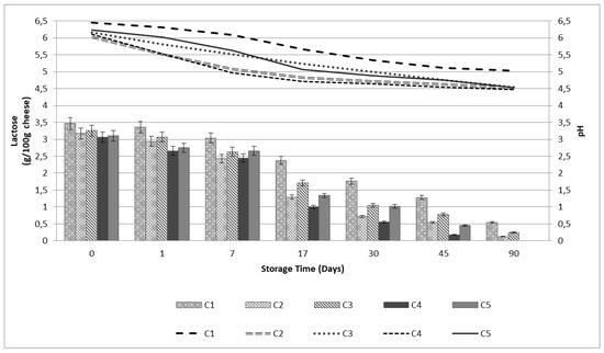 Figure 3 demonstrates the changes in the pH and lactose content during ripening and storage time. A strong interaction was observed between the starter culture and ripening time affecting lactose concentration and pH. The part of lactose which remained in cheese after curd draining decreased in all cases during ripening and storage (Figure 3). Lactose was catabolized by the starter culture as well as non-starter lactic acid bacteria and other microorganisms mainly during the 1st ripening period [15]. As a result, in the case of Feta-type cheese produced with immobilized L. paracasei K5 (C4, C5) we can observe that no lactose content was detected by the end of the storage period (90th day), while in the case of Feta-type cheese produced with L. paracasei K5 free cells (C2, C3) only traces of lactose were detected. The use of the novel starter culture significantly affected lactose content compared to control cheese samples (C1) during cheese ripening and storage. Subsequently, all cheese samples manufactured with L. paracasei K5 starter culture (C2, C3, C4, C5) were characterized by a significantly (p < 0.05) lower pH and lactose content, compared to control cheese samples (C1). This result is in accordance with previous studies that reported significant lactose reduction during the 1st period of Feta-type cheese ripening [12,15].