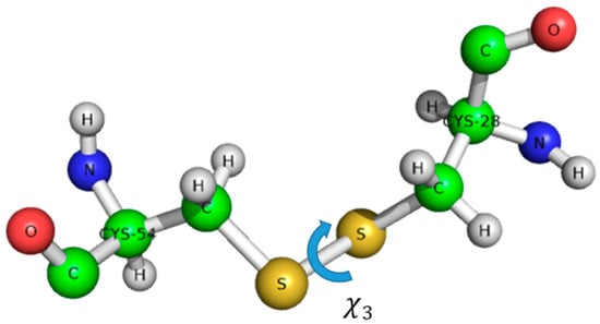 Definition of χ3 dihedral angle on the example of Penicillium chrysogenum antifungal protein (PAF) Cys28-Cys54 disulfide bond.