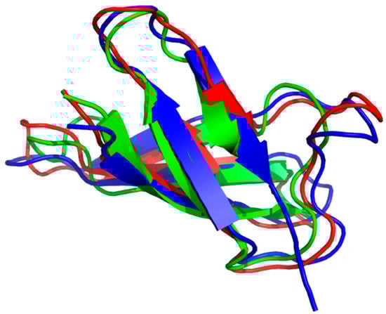 Triple alignment of anti-fungal protein (AFP) (1afp), PAF (2mhv) and Neosartorya fischeri antifungal protein (NFAP) (5oqs) along their CA atoms. (Pymol software tool). Antiparallel β-strands represented by arrows form two overlapping β-sheets. Consecutive strands are connected by short turns or longer loop regions. Green color stands for AFP, red for PAF and blue for NFAP.