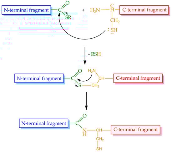 Even though the above-mentioned cycles of the SPPS could be repeated theoretically without limitations, in practice, the size of the peptides or proteins that could be prepared by stepwise synthesis was limited to approximately 50 amino acid residues, and this size was sequence dependent. Therefore, a large demand existed for the possibility to increase the size of peptides and proteins synthesized by chemical methods. The most promising approach was the introduction of native chemical ligation (NCL) by Kent and coworkers in 1994 [42]. The strategy is based on a reversible thioester exchange between a C-terminal peptide thioester and an N-terminal cysteine of another peptide yielding thioester intermediate. It undergoes a rapid and irreversible intramolecular rearrangement producing a native peptide bond between the two fragments (Figure 3).