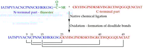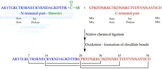 In many cases, native proteins and their variants—even when equipped with 15N, 13C isotope labelling—can be prepared by recombinant expression. In the last two decades discovery of genetically encoded fluorescent tags and improvements in non-standard amino acid incorporation into proteins [15,16,17,18] have opened the way for the preparation of labelled or non-proteinogenic amino acid containing proteins by biotechnological methods. Nevertheless, recombinant protein expression has limitations, e.g., low yields in some host systems [19,20,21]. Alternatively, chemical synthesis can be used as a complement to biotechnology (Table 2). A byproduct of the chemical synthesis of native proteins is that it may help to verify structural details, e.g., to find the right disulfide pattern, that is sometimes difficult to prove by other means, e.g., by NMR.