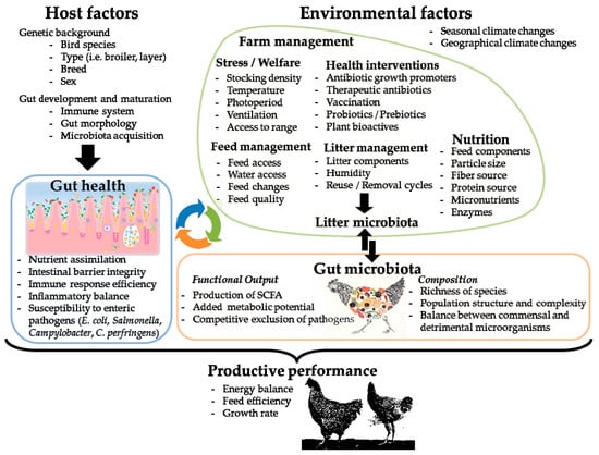 The structure and functionality of the intestinal microbiota is crucial for the health of poultry since the process of acquisition and maturation of the gut microbiota throughout the growth cycle of the birds has a strong influence on the development of the intestinal epithelium and the modulation of the physiological functions required to maintain intestinal homeostasis (i.e., immunity, nutrient digestion, intestinal barrier integrity), and in turn these functions are essential to optimize the efficiency of extraction and use of energy by the host [2]. In this review, most of the information available about the factors that shape the gut microbiota of poultry regarding their interaction with the physiological functions of the host has been collected, with focus on the impact of these interactions on intestinal health and productive performance of the birds.