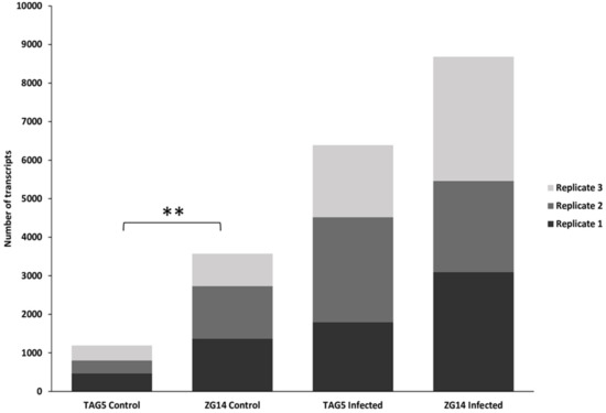Extracted fungal transcripts between the E. grandis clones and treatments. The number of fungal transcripts per replicate extracted from E. grandis TAG5 and ZG14 control and infected data sets. ** p < 0.01.