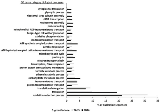 Blast2GO terms in category biological processes. Most abundant gene ontology (GO) terms of fungal transcripts in E. grandis clones TAG5 and ZG14 control samples.
