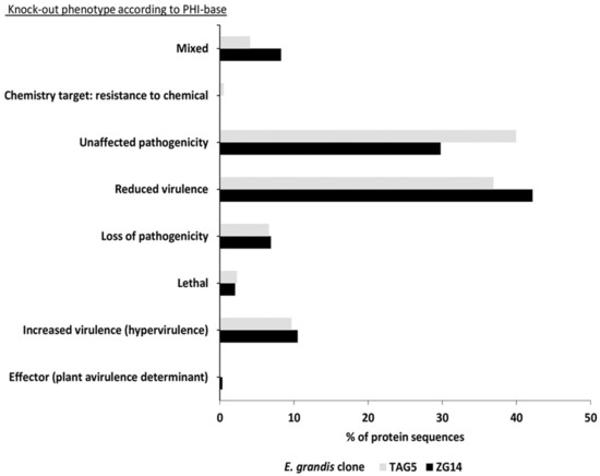 Out of all fungal protein sequences aligned to the PHI-base, 37% of the TAG5 data and 41% of the ZG14 data resulted in information on genes that affect the outcome of pathogen–host interactions (Figure 5, Table S12). Thereby, the fungal proteins from the two E. grandis clones showed a similar distribution of PHI-base knockout phenotypes. Of 393 transcripts with a PHI-base hit, 236 showed an effect on pathogenicity for TAG5, whereas 157 had no known effect. Of 581 transcripts with a PHI-base hit in the ZG14 data, 408 showed an effect on pathogenicity and 173 had no known effect. Most proteins found affecting pathogenicity fell into the category “reduced virulence” (TAG5: 37%, ZG14: 42%), whereas 10% of the proteins showed increased virulence compared to the wild-type. An additional 2% of the fungal proteins were potentially essential for pathogen survival as knockouts of their homologs result in a lethal phenotype.