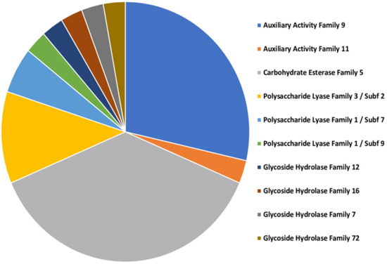 Using the FunSecKB database we found 45 predicted secreted proteins for TAG5 and 96 for ZG14 transcripts (Table 2, Tables S13–S15). The majority of the proteins aligned against the dbCAN2 database fell into carbohydrate esterase family 5 (13) and auxiliary activity family 9 (10) (Figure 6, Table S16). Combined, 13 proteins belonged to the carbohydrate esterase, 11 to the auxiliary activity, seven to the polysaccharide lyase and four to the glycoside hydrolase CAZyme family.