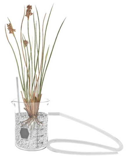 Schematic representation of the CW-microcosm with J. acutus plant and gravel as substrate. The pipette on the left allows to introduce the contaminated irrigation solution into the beaker and the tube on the right allows to collect the microcosm effluent for further analyses.