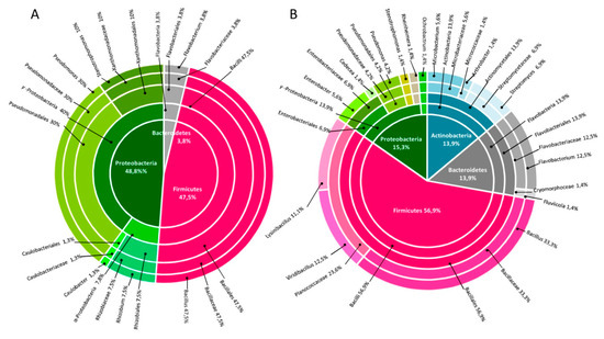 Taxonomic distribution of 16S rRNA sequences of culturable endophytic (A) and rhizospheric (B) bacteria isolated from P. australis plants. The inner pie graph shows the strain taxonomic identification according to phylum and each outer ring represents their identity at the class, order, family and genus level.