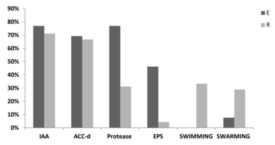Characterization of the bacteria collection for plant growth promotion (PGP) traits. Percentage of strains isolated from endosphere (E, black) and rhizosphere (R, gray) fractions that resulted positive to PGP assays. Among PGP activities: IAA = indole-3-acetic acid production, ACC-d = ACC deaminase activity, Protease = protease production, EPS = exopolysaccharides production, SWIMMING = swimming lifestyle, SWARMING = swarming lifestyle.