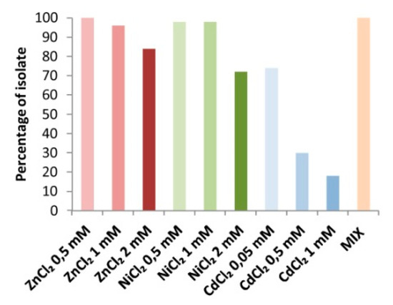 Characterization of the bacteria collection for metal tolerance. Percentage of strains tolerant to ZnCl2, NiCl2 and CdCl2 at three different concentrations and to the MIX of metals (30 µM ZnCl2, 1.7 µM NiCl2 and 0.1 µM CdCl2).