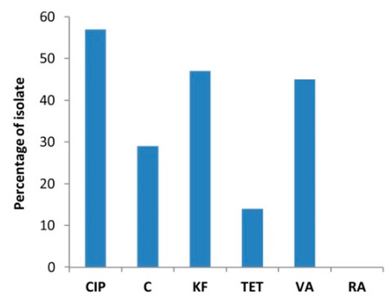 Characterization of the bacteria collection for antibiotic resistance. Percentage of strains resistant to CIP = ciprofloxacin (5 µg); C = chloramphenicol (30 µg); KF = cephalotin (30 µg); TET = tetracycline (30 µg); VA = vancomycin (30 µg); RA = rifampicin (5 µg).
