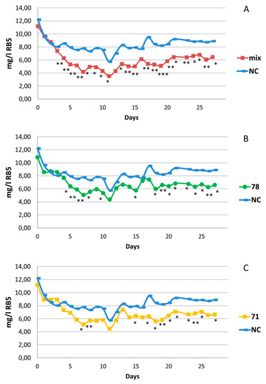 Concentration of RB5 daily measured from microcosm effluents over the experimental period (27 days). Values are reported as a means of the replicated CW microcosms (n = 3). RB5 concentration was compared between (A) NC = negative control, non-bacterized J. acutus plants, and plant inoculated using a consortium of the six isolates (mix); (B) NC and plants inoculated with 78 = E. ludwigii CWMP-8R78; (C) NC and plants inoculated with 71 = F. jonhsoniae CWMP-8R71. The stars indicate the days were statistically significant differences were observed (* p < 0.05, ** 0.001 < p < 0.01, *** p < 0.001).