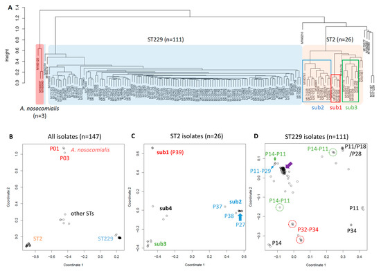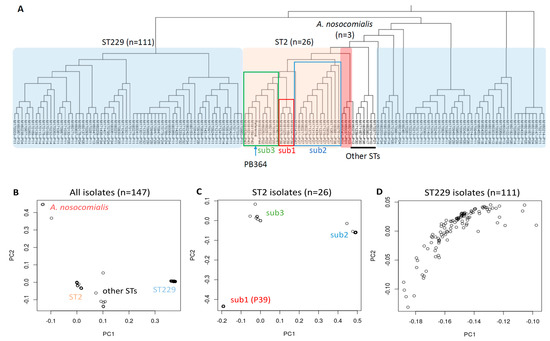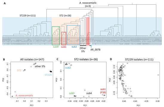 Alignment/mapping-based analysis of 147 Acinetobacter clinical isolates using the PB364 genome (ST2) as reference. (A) Phylogeny tree generated from core single nucleotide variants (SNVs) analysis. Neighbor-joining method is used, and branch length is ignored. The shadowed reference is PB364. (B–D) Overview of clinical isolates from principal component analysis. B: all 147 isolates; C: 26 ST2 isolates with PB364 excluded; and D: 111 ST229 isolates. Three main sub-clusters are identified in ST2 isolates: sub1, sub2 and sub3.