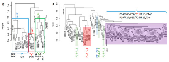 We implemented this k-mer-based pipeline in the analysis of the 147 Acinetobacter clinical isolates, results of which are shown in Figure 4. After de novo assembly, we found eight isolates (5.4%) had an outstanding “genome” size (≥ 4.4 Mb, as we estimated A. baumannii genome at ~4.0 Mb), and applied Kraken2 for clean up using Acinetobacter genus level as cutoff (Supplementary Table S2). MLST from the assembled genome had better identification than SRST2 did, with only five isolates (3.4%) not being typed. Of these five isolates, three (M180217, M180278 and M180317) carried a SNV in fusA gene, one (M160380) was a new ST, and the other one (M160272) was mixed up with an A. nosocomialis isolate (species A. baumannii, not genus, was therefore exceptionally used as the cutoff in clean up). Notably, the three A. nosocomialis isolates (M160037, M160040 and M160120) were mis-recognized by the mlst algorithm as ST359 and ST71 of A. baumannii (Supplementary Table S2). In kWIP metric multidimensional scaling (MDS) plots, similar to a PCA, we observed significantly better clustering of all samples into four main clusters; of 26 ST2 isolates into four main sub-clusters; and of 111 ST229 isolates with a major and some other sub-clusters (Figure 4B–D), comparing to those from alignment/mapping-based method (Figure 2B–D and Figure 3B–D). The improved clustering indicated little evidence of HAI in clusters of A. nosocomialis and STs other than ST2 and ST229; and the refined sub-MLST clustering refuted suspected HAI of ST2 isolates (Figure 4E), among which the closest relatedness was between M181159 (patient P40, Unit H), M181521 and M181539 (patient P43, Unit F). Notably, refuting outbreaks could reduce unnecessary infection control investigation and intervention [6] and save significantly on the financial cost. However, the refined sub-MLST clustering of ST229 isolates supported the suspected transmission (Figure 4D,F). The major sub-cluster of ST229, representing the main transmission cluster, included isolates from patients P04–P06, P11, P13, P14, P19, P24–P26, and P29, and an environmental isolate (closely related to some of P11 isolates). Although they could be tracked down further by zoom-in with kWIP sub-sub-cluster analysis, we reckoned the results might be jeopardized by background noises from contaminations and/or bacterial evolution in patients. Intriguingly, based on the kWIP analysis of genomic context, we detected five sub-MLST types in patient P14 and approximately six in P11 during their hospital stay, four of which were shared between them; two sub-MLST types in P32 and three in P34, two of which were shared in both patients; additionally, two sub-MLST types shared by patients P29 and P11 (Figure 4D,F).