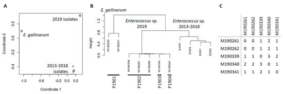 Whole-genome analysis of 11 Enterococcus sp. isolates. (A) Plot of metric multidimensional scaling (MDS) based on kWIP analysis. (B) Phylogeny tree from kWIP weighted metric hierarchical clustering. (C) Pair-wise comparisons of single nucleotide variants (SNVs) based on snippy analysis using the M190262 draft genome as reference.