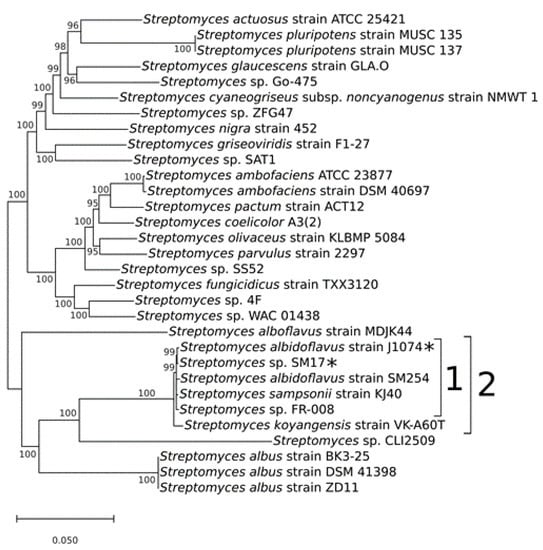 Phylogenetic tree of the concatenated sequences of the 16S rRNA and the housekeeping genes atpD, gyrB, recA, rpoB, and trpB, from the Streptomyces sp. SM17 together with 30 Streptomyces isolates for which complete genome sequences were available in the GenBank database. Analysis was performed using MrBayes, with a posterior probability cut-off of 95%. 1) albidoflavus phylogroup. 2) Clade including the neighbour isolate Streptomyces koyangensis strain VK-A60T. The strains SM17 and J1074 are indicated with asterisks.