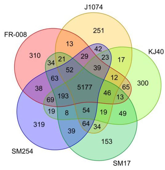 A total of 7565 genes were identified in the albidoflavus pan-genome, and among these a total of 5177 were determined to be shared among all the albidoflavus isolates (i.e., the core genome) (Figure 2). This represents a remarkably high proportion of genes that appear to be highly conserved between all the isolates, representing approximately 68.4% of the pan-genome. Additionally, when considering the genomes individually (Table S1), the core genome accounts for approximately 84.5% of the FR-008 genome; 88.5% of J1074; 85.5% of KJ40; 86.7% of SM17; and 83.7% of the SM254 genome. On the other hand, the accessory genome (i.e., genes present in at least two isolates) was determined to consist of 1055 genes (or ~13.9% of the pan-genome); while the unique genome (i.e., genes present in only one isolate) was determined to consist of 1333 genes (or ~17.6% of the pan-genome). This strikingly high conservation of genes present in their genomes together with the previous multi-locus phylogeny analysis are very strong indicators that these microorganisms may belong to the same species.