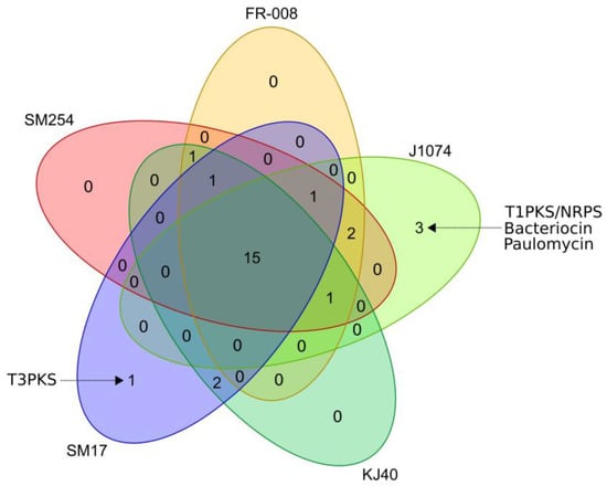 In order to further in silico assess the potential of these albidoflavus phylogroup isolates to produce secondary metabolites, and also to determine how potentially similar or diverse they are within this phylogroup, prediction of secondary metabolites biosynthetic gene clusters (BGCs) was performed using the antiSMASH (version 5) program [42]. The antiSMASH prediction was processed using the BiG-SCAPE program [43], in order to cluster the BGCs into gene cluster families (GCFs), based on sequence and Pfam [64] protein families similarity, and also by comparing them to the BGCs available from the minimum information about a biosynthetic gene cluster (MiBIG) repository [44] (Figure 3). When compared to known BGCs from the MiBIG database, a significant number of BGCs predicted to be present in the albidoflavus phylogroup genomes could potentially encode for the production of novel compounds, including those belonging to the non-ribosomal peptide synthetase (NRPS) and bacteriocin families of compounds (Figure 3). The presence/absence of homologous BGCs in the albidoflavus isolates’ genomes was determined using BiG-SCAPE and is represented in Figure 4. Interestingly, the vast majority of the BGCs predicted in the albidoflavus phylogroup are shared among all of its members (15 BGCs); while another large portion (8 BGCs) are present in at least two isolates (Figure 4). Among the five members of the albidoflavus phylogroup, only the J1074 strain and the SM17 strain appeared to possess unique BGCs when compared to the other strains. Three unique BGCs were predicted to be present in the J1074 genome: a predicted type I polyketide synthase (T1PKS)/NRPS without significant similarity to the BGCs from the MiBIG database; a predicted bacteriocin, which also did not show any significant similarity to the BGCs from the MiBIG database; and a BGC predicted to encode for the production of the antibiotic paulomycin, with similarity to the paulomycin-encoding BGCs from Streptomyces paulus and Streptomyces sp. YN86 [65], which has also been experimentally shown to be produced by the J1074 strain [60]. One BGC predicted to encode a type III polyketide synthase (T3PKS)—with no significant similarity to the BGCs from the MiBIG database—was also identified as being unique to the SM17 genome.