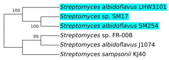 The NCBI BLASTN tool [36,37] was used to determine the closest 30 Streptomyces strains with complete genome available in the GenBank RefSeq database [35] to the Streptomyces sp. SM17. Then, phylogeny analysis was performed with the concatenated sequences of the 16S rRNA, and the housekeeping genes atpD, gyrB, recA, rpoB, and trpB. The sequences were aligned using the MAFFT program [38], and the phylogeny analysis was performed using the MrBayes program [39]. In MrBayes, the general time reversible (GTR) model of nucleotide substitution was used [40], with gamma-distributed rates across sites with a proportion of invariable sites, with 1 million generations sampled every 100 generations. Final consensus phylogenetic tree generated by MrBayes was processed using MEGA X [41], with a posterior probability cut-off of 95%.
