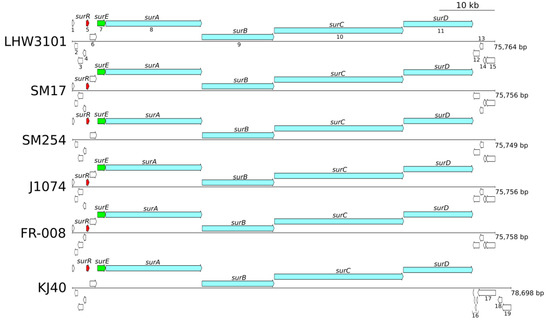 The genome regions previously determined to share similarities with the S. albidoflavus LHW3101 sur BGC were manually annotated, for the known main biosynthetic genes (surABCD), the penicillin binding protein (PBP)-like peptide cyclase and hydrolase surE gene, and the gene with regulatory function surR [15,16,17,18,19,21]. This was performed using the UniPro UGENE toolkit (version 1.32.0, available at http://ugene.net/) [46], the GenBank database, and the NCBI BLASTN tool (available at https://blast.ncbi.nlm.nih.gov/Blast.cgi, accessed on June 2019) [35,36,37]. The gene synteny and reading frame analysis was performed using the UniPro UGENE toolkit [46] and the Artemis genome browser (version 18.0.0, available at https://www.sanger.ac.uk/science/tools/artemis) [47].
