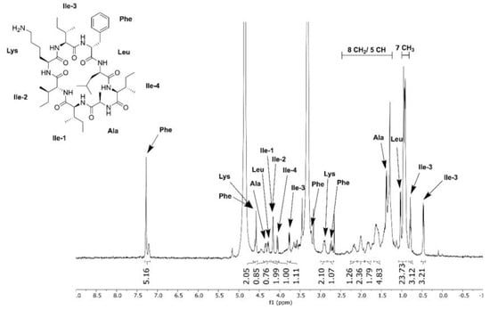 To confirm the production of surugamide A by the SM17 isolate, extracts from the TSB, SYP-NaCl, and YD media were combined and purified using high-performance liquid chromatography (HPLC). The structures of the major compounds of the extract were subsequently analysed using nuclear magnetic resonance (NMR) spectroscopy, which allowed for the identification of the chemical structure of the surugamide A molecule as major metabolite by comparison with reference NMR data (Figure 7) [14].