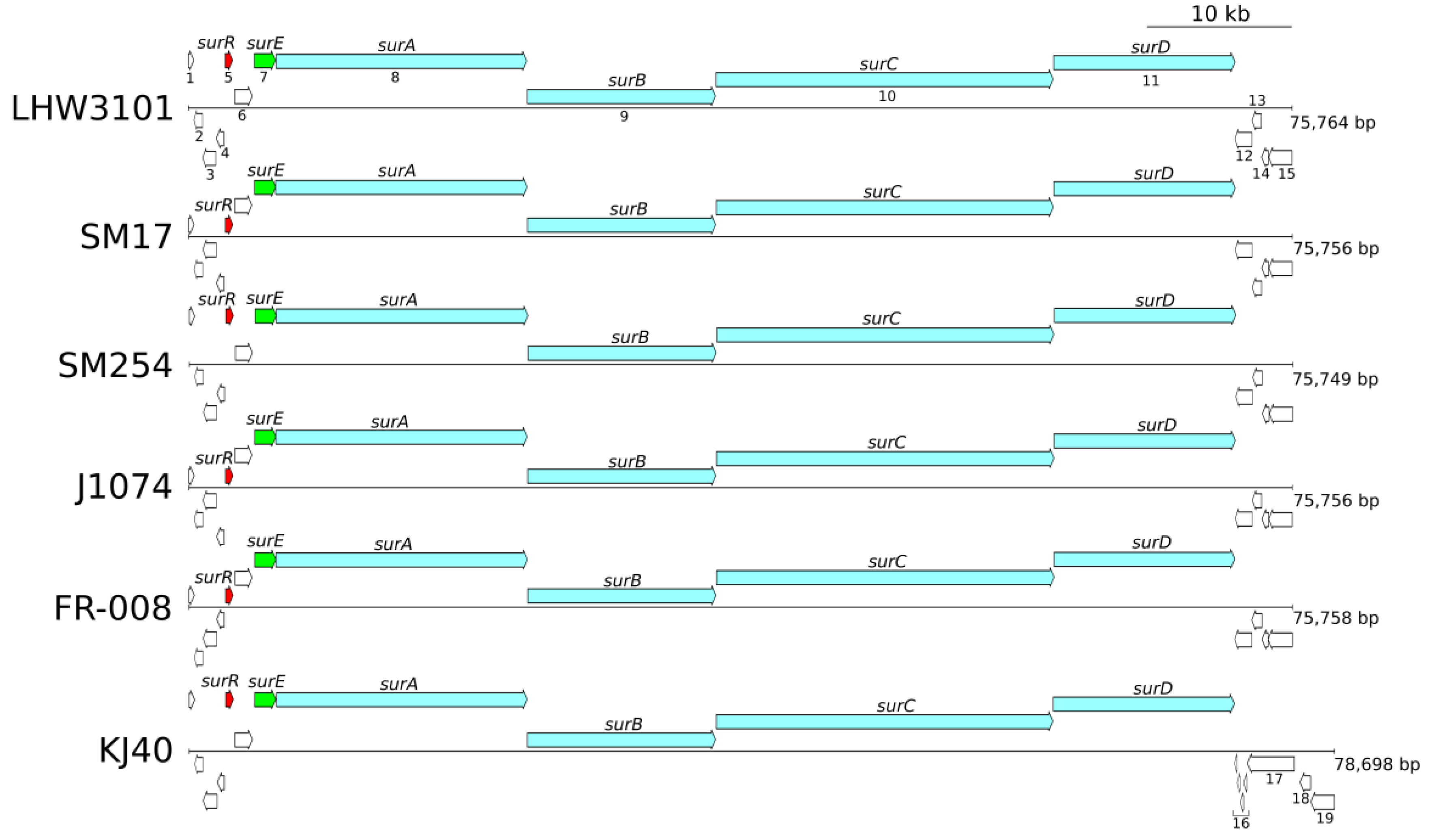 3.4. Phylogeny and Gene Synteny Analysis of Sur BGC Homologs