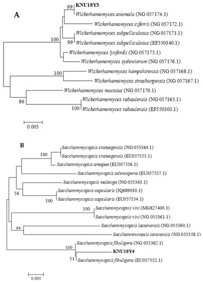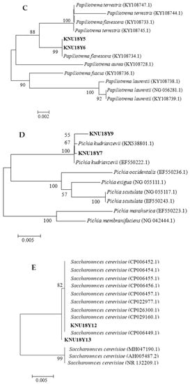 Phylogenetic relationship between the identified yeasts and other 26S rRNA sequences of published strains. (A) Wickerhamomyces anomalus strain KNU18Y3, (B) Saccharomycopsis fibuligera strain KNU18Y4, (C) Papiliotrema flavescens (strain KNU18Y5, KNU18Y6), (D) Pichia kudriavzevii (strain KNU18Y7 and KNU18Y9) and (E) Saccharomyces cerevisiae (strain KNU18Y12 and KNU18Y13).
