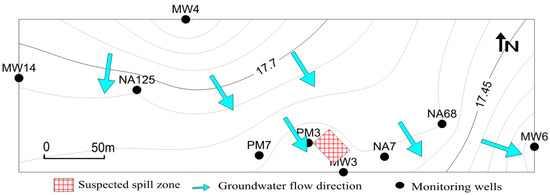 Map showing suspected spill zone, monitoring wells, and groundwater flow.
