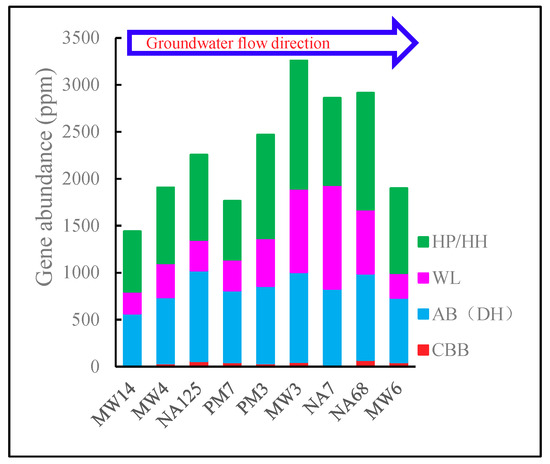 The amount of genes encoding carbon fixation was more than 1500 ppm in all samples. Except for MW6, the abundance of carbon fixation genes was greater than that of genes involved in nitrate and sulfate reduction (Supplementary Figure S2), both of which are the primary biodegradation reactions in petroleum-contaminated groundwater [22,43]. Therefore, there would be a big carbon sink effect in the aquifer. The carbon fixation metabolism should be considered in future studies of petroleum-contaminated aquifers.
