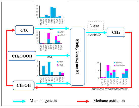 Methane metabolism includes methanogenesis and methane oxidation. Methanogens can obtain energy for growth by converting a limited number of substrates to methane under anaerobic conditions. Three types of methanogenic pathways are known: CO2 to methane, methanol to methane, and acetate to methane [44]. According to the KEGG pathway map, all the methanogenic pathways can generate the same intermediate product, methylcoenzyme M, which will be reduced to methane by methyl-coenzyme M reductase (Figure 3). The abundance of mer, cdh, and mta is ~70, ~20, and ~3 parts per million (ppm), respectively. Therefore, the pathway of CO2 to methylcoenzyme M is dominant. This process mainly occurs around the contaminated source area (PM3 to MW3). It may be because there was less dissolved oxygen (DO) in the area (Table 1), making it suitable for the reduction of CO2 [45]. According to Figure 3, there was no detected mcr gene encoding methyl-coenzyme M reductase, which is associated with the final stage of methanogenesis. That may because there was no methanogenic redox environment or there were other adequate preferred electron acceptors for microorganisms (Table 1). Therefore, it is suggested that little methane would be generated from the aquifer and released to the atmosphere.