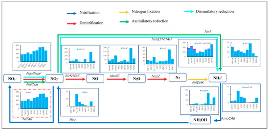 NxrAB gene, encoding oxidization of nitrite to nitrate, was abundant in all samples. That is because the NxrAB gene shares the same enzyme with Nar. The enzyme is nitrite oxidoreductase, which can convert either nitrate to nitrite or nitrite to nitrate [55]. In anaerobic conditions, the enzyme may mostly play a reduction role.