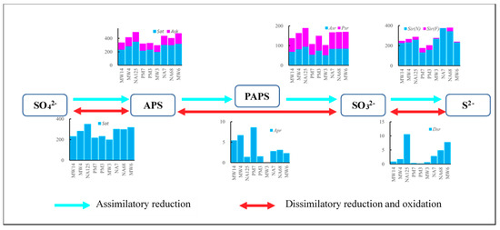There are four steps in assimilatory reduction. The genes encoding the enzymes that transform sulfate to (adenylyl sulfate) APS and then (3’-phosphoadenylyl sulfate) PAPS are Sat and Ask, whose total abundance was about 300 ppm to 500 ppm. The transformation of PAPS to sulfite genes involves Asr and Psr genes, which account for about 100 ppm to 200 ppm. The sulfite-to-sulfide transformation genes are Sir(N) and Sir(F), which account for 150 ppm to 400 ppm. Interestingly, the abundance of genes involved in each step of assimilatory reduction was less in contamination source area samples (PM7, PM7, and MW3) than other samples. The lower abundance of Sat and Ask genes in samples from the contamination source area may be caused by the coaction of redox conditions and contaminant concentrations. The Sat gene is also involved in sulfur oxidation (Figure 5), which would be an aerobic or nitrate reduction process [59,60]. More Sat genes in upstream and downstream wells may be caused by higher DO and nitrate concentrations. Moreover, sulfur oxidation needs reduced sulfur compounds, which would be supplied by the reduction of sulfate in contaminated areas. Therefore, areas with higher DO, nitrate, and contaminant concentrations may have higher Sat gene abundance. Asr (Psr) and Sir genes may share the most abundant microorganism, Novosphingobium, and other microorganisms with the Sat gene (Supplementary Figure S3), which may result in similar distribution among Sat, Asr (Psr), and Sir genes.