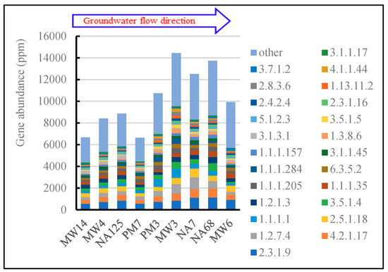 The components of petroleum contaminants are complex and hard to pick out one by one. Different components may have different metabolic pathways, and there are dozens of enzymes involved in the biodegradation of one component. Moreover, a particular enzyme could be involved in many pathways. Therefore, it is hard to identify the genes involved in the biodegradation of every petroleum contaminant, and all the genes in the xenobiotics biodegradation and metabolism level of the KEGG database were considered as a whole to identify the potential biodegradation ability of petroleum contaminants in the aquifer (Figure 6). There was a higher abundance of genes, greater than 10,000 ppm, in PM3, MW3, NA7, NA68, and MW6 samples, corresponding to the higher concentrations of contaminants (Table 1).