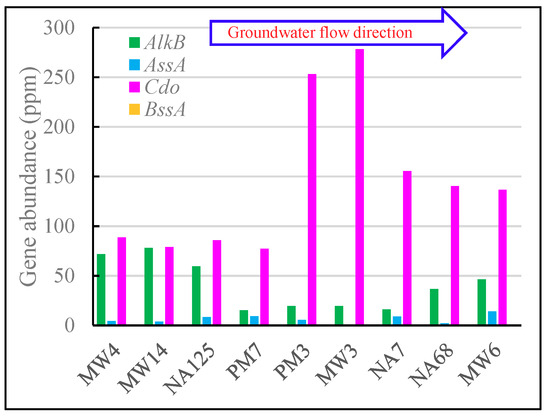 The presence of the alkane 1-monooxygenase gene (AlkB, EC 1.14.15.3) and catechol dioxygenase genes (Cdo, EC 1.13.11.1 and EC1.13.11.2) implies the degradation of medium-chain (C5–C22) alkanes and aromatic hydrocarbons, respectively, using oxygen as an electron acceptor [66,67], while the formate C-acetyltransferase gene (AssA, EC 2.3.1.54) and benzylsuccinate synthase gene (BssA, EC:4.1.99.11) imply the degradation of chain alkanes and aromatic hydrocarbons, respectively, in anaerobic conditions [13,68]. Figure 7 shows the distribution of these genes in the aquifer.