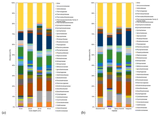 Bacterial classification among (a) core depth sampled sites by taxonomy for the cohort family and (b) habitat sampled sites by taxonomy for the cohort family.