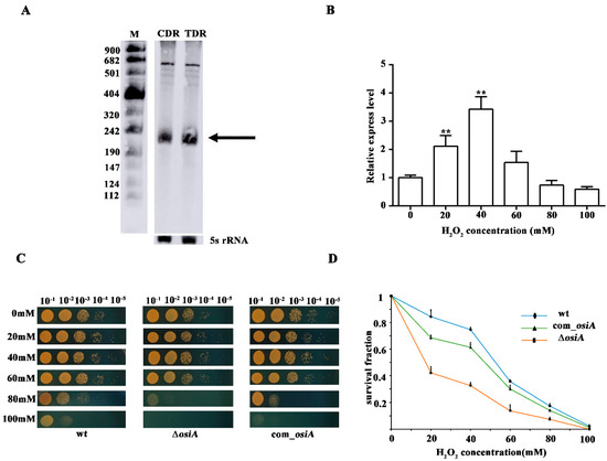 Stress tolerance analysis of OsiA. (A) Northern blotting identification of OsiA. CDR is the control conditions, while TDR is the H2O2-treated conditions, with the arrow indicating OsiA, while 5S rRNA bands are shown as loading controls. (B) The expression profile of OsiA. ** means that the expression of OsiA is significantly different from that of the wild-type strain, that is, the p value is less than 0.01. (C) The phenotypic analysis of osiA knockout mutant, the osiA complementary strain, and the control under different H2O2-treated conditions. (D) Survival growth analysis of the osiA knockout mutant, osiA complementary strain, and the control under different H2O2-treated conditions.