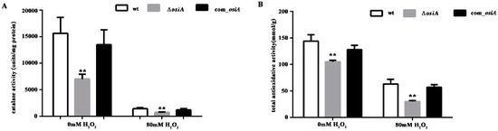 Catalase activity and total antioxidative activity of the wild type strain and osiA mutant strain. (A) Catalase activity of the wt, ∆osiA, and osiA complementary strain. (B) Total antioxidative activity of the wt, ∆osiA, and osiA complementary strain. ** means the difference is very significant compared with the control group, that is, the p value is less than 0.01.
