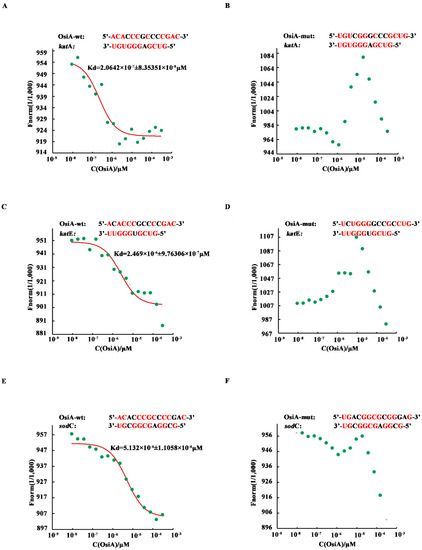 To investigate whether OsiA binds directly to the target genes, microscale thermophoresis was applied to identify the binding strength between OsiA or its mutants and the corresponding complementary fragment in the mRNA of target genes (katA, katE, sodC). Among the tested genes, katA mRNA had the strongest binding force with OsiA. The interaction of katE mRNA and OsiA was ranked second, while sodC mRNA had the weakest binding with OsiA. According to the predicted binding strength in different combinations, we mutated different bases in OsiA and then assayed the change in binding strength (Figure 3A,C,E). As expected, the binding strength between the mutated OsiA variants and their target genes was completely disrupted (Figure 3B,D,F), suggesting that OsiA strongly binds to the target genes through different bases. Using katA mRNA as an example, when the binding sequence ACACCCGCCCCGAC of OsiA was replaced by the mutated sequence UGUCGGGCCCGCUG, no binding could be detected between OsiA and katA mRNA.