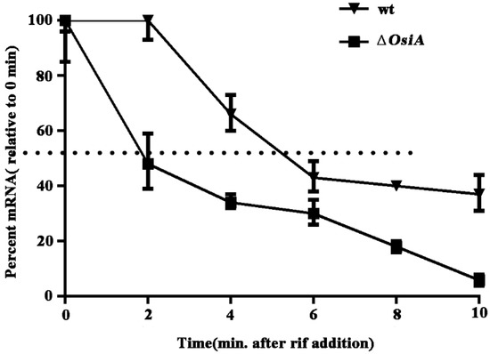 The half-life of katA mRNA in the wildtype strain was 5 min, but this decreased to 2 min with osiA knocked out under the H2O2 treated condition (Figure 4). This result indicates that OsiA regulated katA mRNA at the posttranscriptional level and enhanced the stability of katA mRNA.