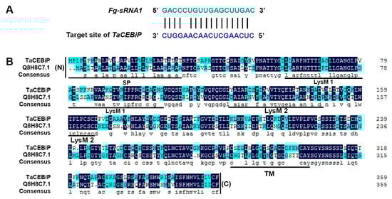 Sequence information of Fg-sRNA1 and TaCEBiP. (A) Schematic diagram of Fg-sRNA1 (green color) and its target site (blue color) in TaCEBiP of common wheat; and (B) alignment of the amino acid sequences between wheat TaCEBiP and Q8H8C7.1 (rice OsCEBiP). The number on the right represents the number of amino acids. Putative coding sequence of TaCEBiP was aligned with rice Q8H8C7.1. Identical amino acids are highlighted with black boxes. SP = signal peptide; LysM 1/LysM 2, LysM motif; TM = transmembrane region; (N) = N-terminus; and (C) = C-terminus.