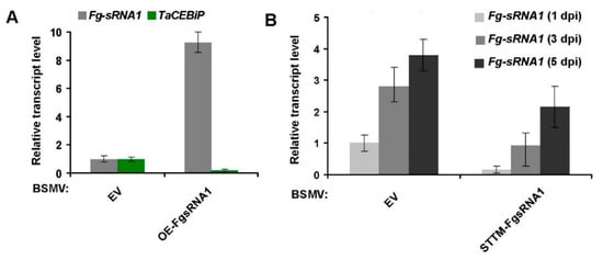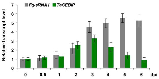 To test whether F. graminearum sRNAs Fg-sRNA1 could indeed suppress wheat genes during infection, Fg-sRNA1 was further characterized. We conducted real-time quantitative PCR (RT-qPCR) analysis to detect the relative transcript level of Fg-sRNA1 and TaCEBiP during F. graminearum infection, and found Fg-sRNA1 was enriched after F. graminearum infection, and expression of TaCEBiP increased gradually until three days post inoculation (dpi) and then decreased, as shown in Figure 2. This result showed that Fg-sRNA1 and TaCEBiP were involved in the process of F. graminearum infection.