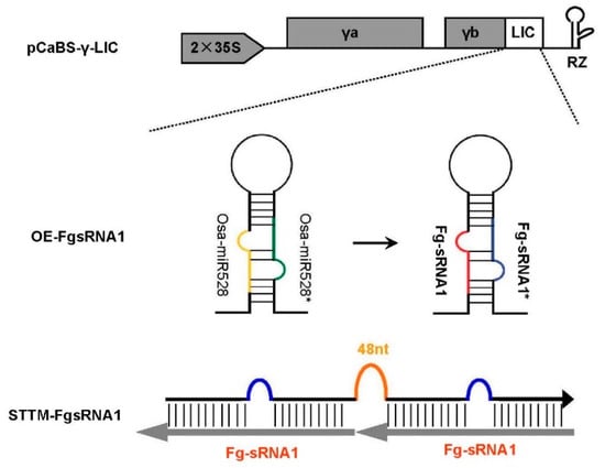 Schematic diagram of integrating BSMV-γb vector and Osa-miR528 precursor harboring Fg-sRNA1 or STTM sequences. Modified BSMV-γb vector (pCaBS-γ-LIC) was shown in this figure. Osa-miR528 precursor harboring Fg-sRNA1 or STTM sequences can be cloned into pCaBS-γ-LIC derivatives by the LIC reaction. OE-FgsRNA1 structure contained an Osa-miR528 precursor backbone, but Osa-miR528 and Osa-miR528* were changed to Fg-sRNA1 and Fg-sRNA1*. STTM-FgsRNA1 structure contained two tandem target mimics separated by a 48 nt imperfect stem-loop linker.