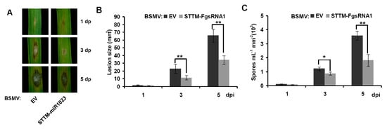 Analysis of lesion size of wheat leaves and F. graminearum spores number after BSMV induced Fg-sRNA1 silencing. (A) Lesion area phenotypes of F. graminearum infected wheat leaves which were pre-inoculated by BSMV empty vector (BSMV: EV) and BSMV: STTM-FgsRNA1, were photographed at 1, 3 and 5 dpi. BSMV = EV infected wheat plants were used as controls; (B) lesion-size (mm2) of corresponding different treatments; and (C) number of F. graminearum spores produced by lesions on corresponding treated wheat leaves. Error bars representing SE were calculated from three replicates. Significance was determined at * p < 0.05 and ** p < 0.01 (n ≥ 3) with a t-test.