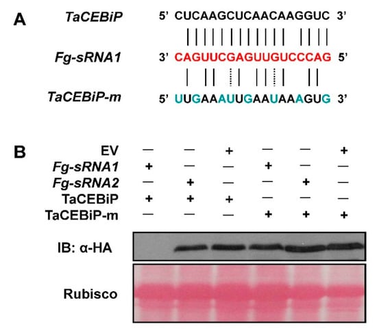 To further confirm that the suppression of TaCEBiP was indeed triggered by Fg-sRNA1, we performed co-expression assays in N. benthamiana. Another sRNA (Sequence information: 5′ UGCAGAUCUUGGUGGUAGUAG3′) from Fusarium graminearum sRNA library was selected as a control. There is no reverse complementation between this sRNA (Fg-sRNA2) and TaCEBiP mRNA chain, although Fg-sRNA2 can target other locations in wheat genome, based on our sequence alignment analysis. Expression of hemagglutinin (HA)–epitope tagged TaCEBiP was reduced when they were co-expressed with the corresponding Fg-sRNA1 but not when co-expressed with Fg-sRNA2, which shared no sequence similarity, as shown in Figure 6B. The silencing was abolished, however, when the target gene TaCEBiP carried a synonymously mutated version of the relevant Fg-sRNA1 target sites, as seen in Figure 6A,B.