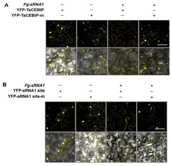 Suppression of YFP–tagged TaCEBiP co-expressed with Fg-sRNA1. (A) Co-expression of YFP-TaCEBiP or its synonymously mutated version (YFP-TaCEBiP-m) with Fg-sRNA1 were observed with confocal microscopy; and (B) Expression of the YFP sensors carrying a Fg-sRNA1 target site of TaCEBiP or a Fg-sRNA1 target site-m, were analyzed after co-expression of Fg-sRNA1. Samples were examined at 48 h after transiently Agrobacterium-mediated transformation into N. benthamiana leaves. (Top) YFP. (Bottom) YFP/bright field overlay. Scale bar is 50 μm. Similar results were obtained in three biological replicates.